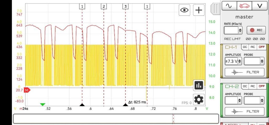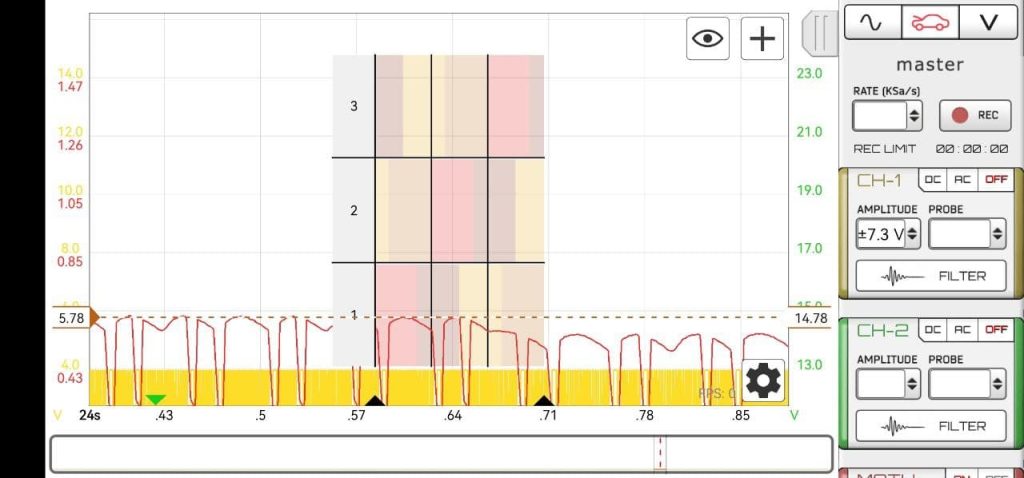 Sample application of this function to detect missfire with Automotive Module (detected 1 missfire event during long period recording):