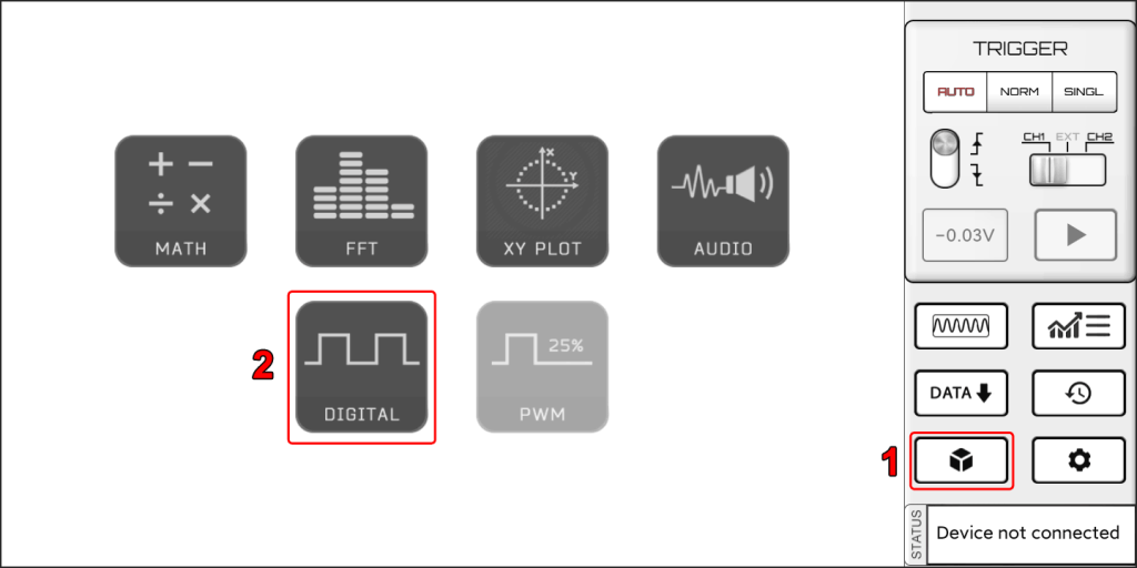 You can see a new panel for the digital channels*. In case your oscilloscope has digital inputs you will be able to turn ON/OFF the digital channels and see them on the screen with the analog channels.