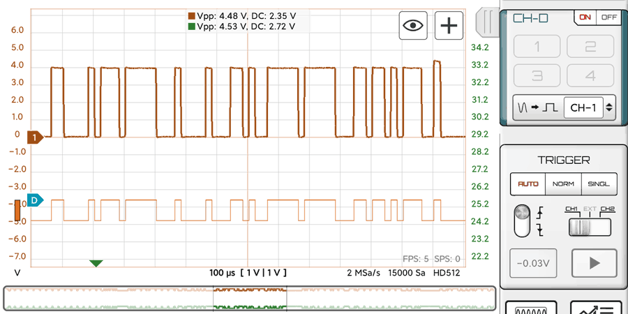 Even if your oscilloscope doesn\'t have digital inputs, you can convert one of the analog channels to a digital signal with the last control on the panel.