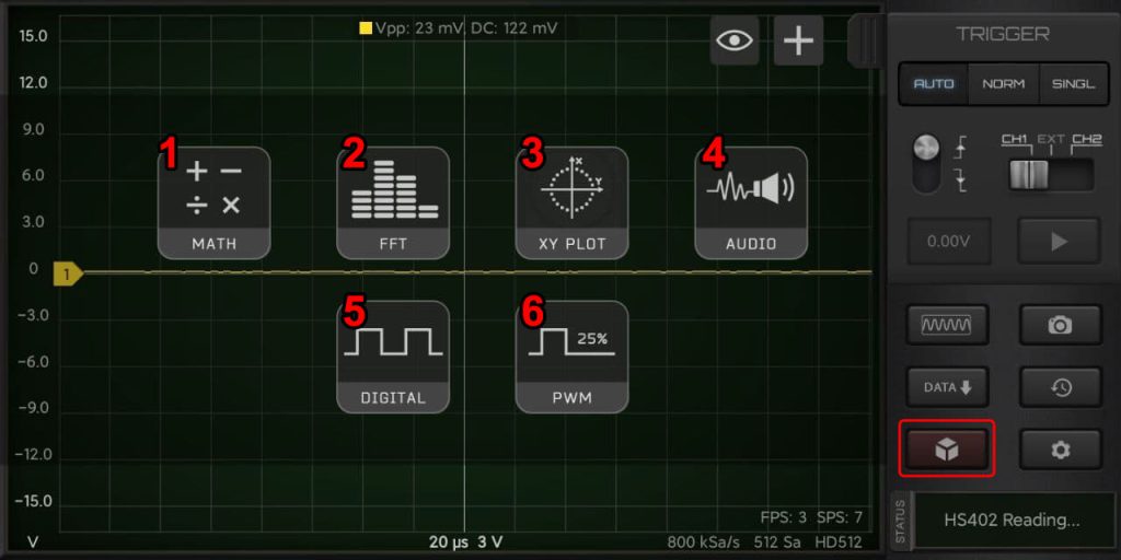 Math Module: allow to compute Math operations among the first 2 channels.FFT: allow to compute the FFT operation.XY Plot: for comparing signals and compute phase shift.Audio Module: for listening the input signal with the phone speaker and compute Amplifiers Power. Instructions here.Digital Module: for analize digital signals.PWM Module: if available in the oscilloscope hardware it control the PWM output.