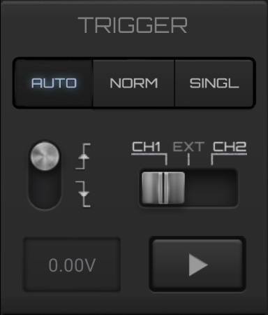 Once decided the kind of trigger (AUTO, NORMAL, SINGLE), you can set the SLOPE (arrow up or down) and the input Channel (only CH1 and CH2 are working and they are oscilloscope depending).