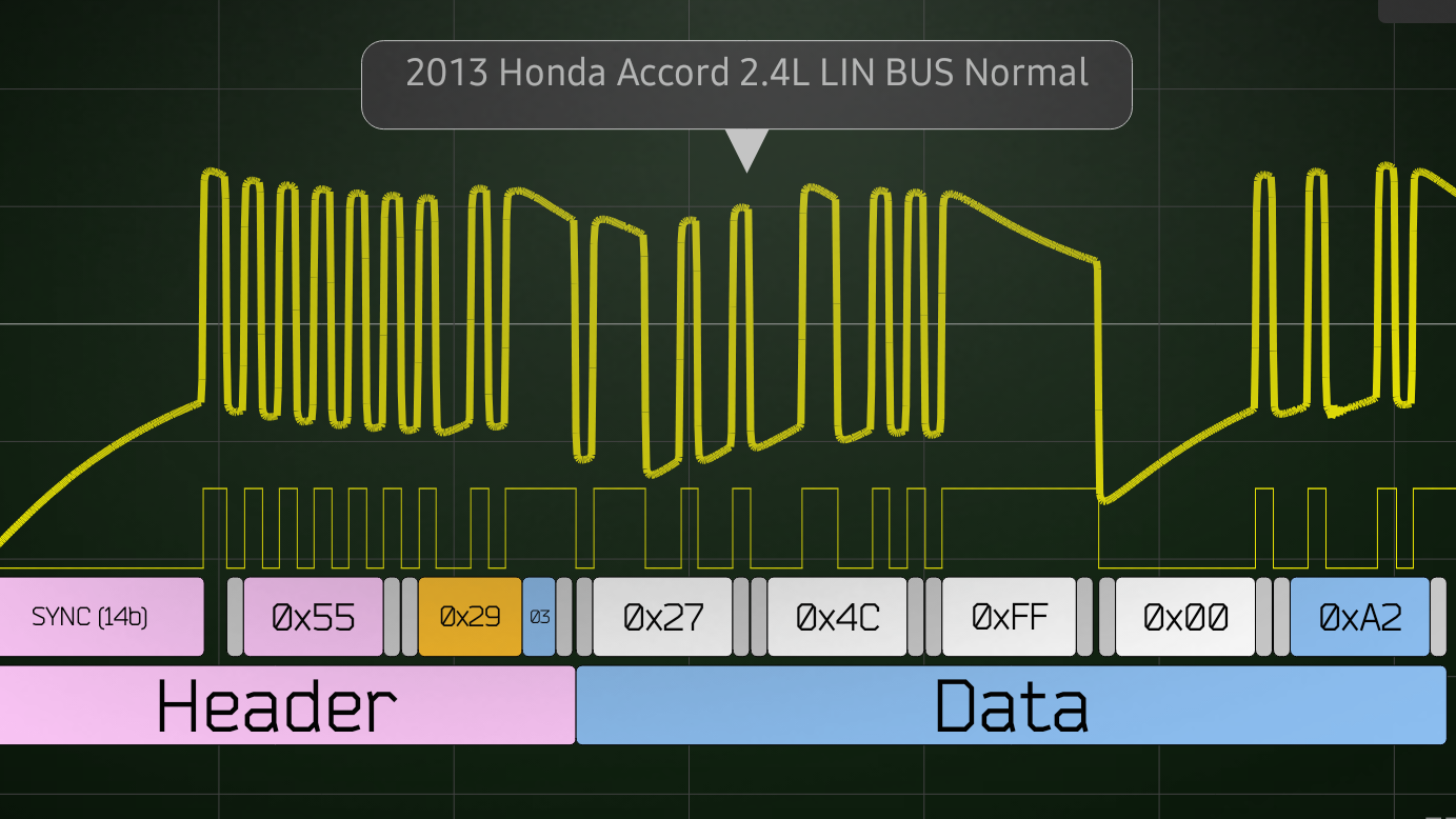 Title : 2013 Honda Accord 2.4L LIN BUS Normal Cloud ID : 4075 Type : Automotive Size : 1.9 MB Oscilloscope : HS512 Max Rate : 300 kSa/s Samples : 3,039,396 Date : October 9, 2025 at 14:55 Author : bekomcar.com