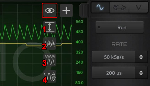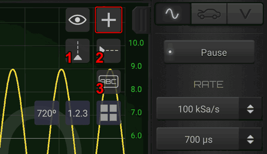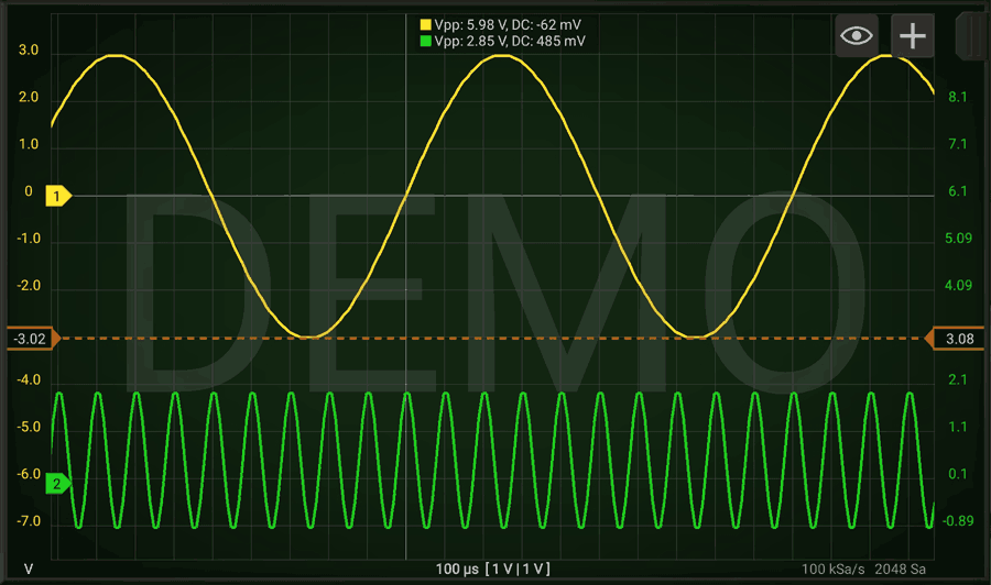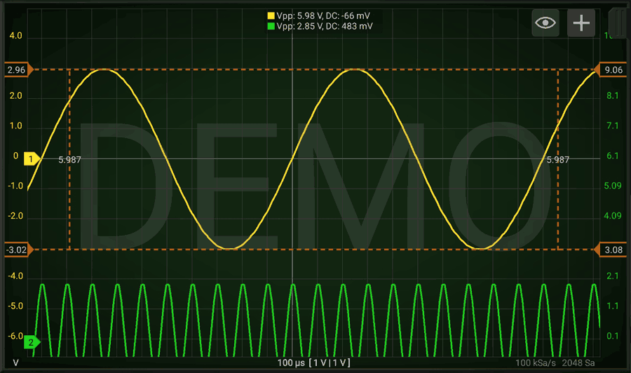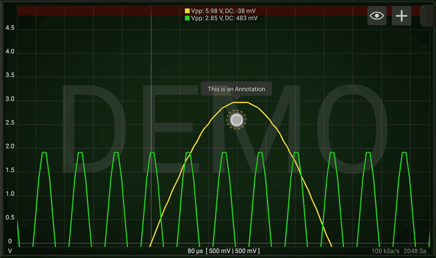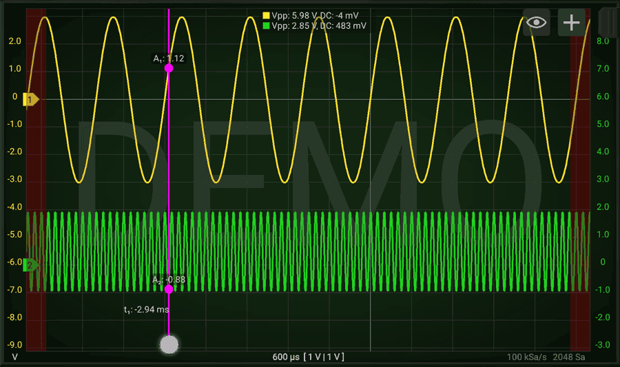 Activating one vertical cursor allows you to measure amplitude of the signals at a certain point. By pressing 2 fingers on the bottom part of the graph you can enable 2 cursors and have relative measurements. (as time and frequency associated to the selected period).