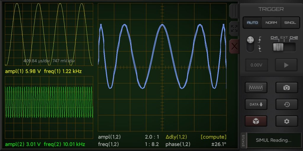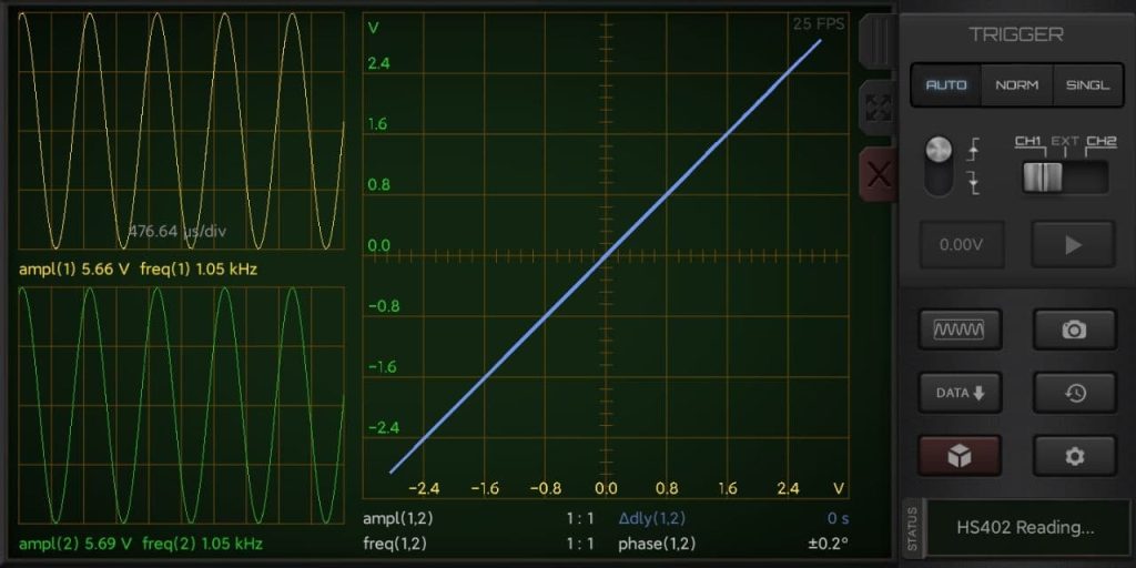 On the left you can see 5 periods of both channel signals with the information about amplitude and frequency.