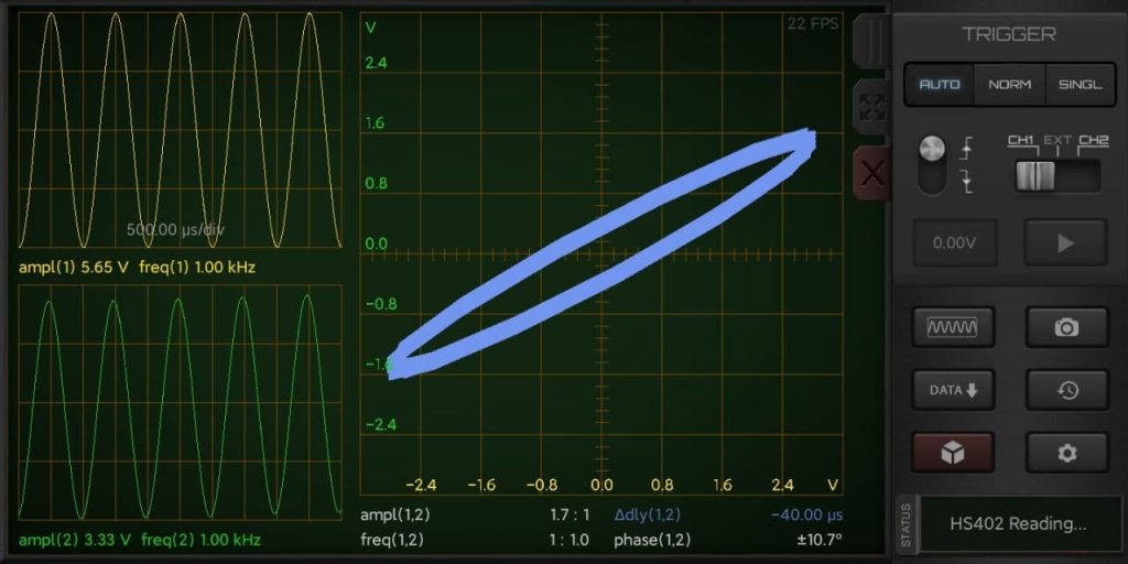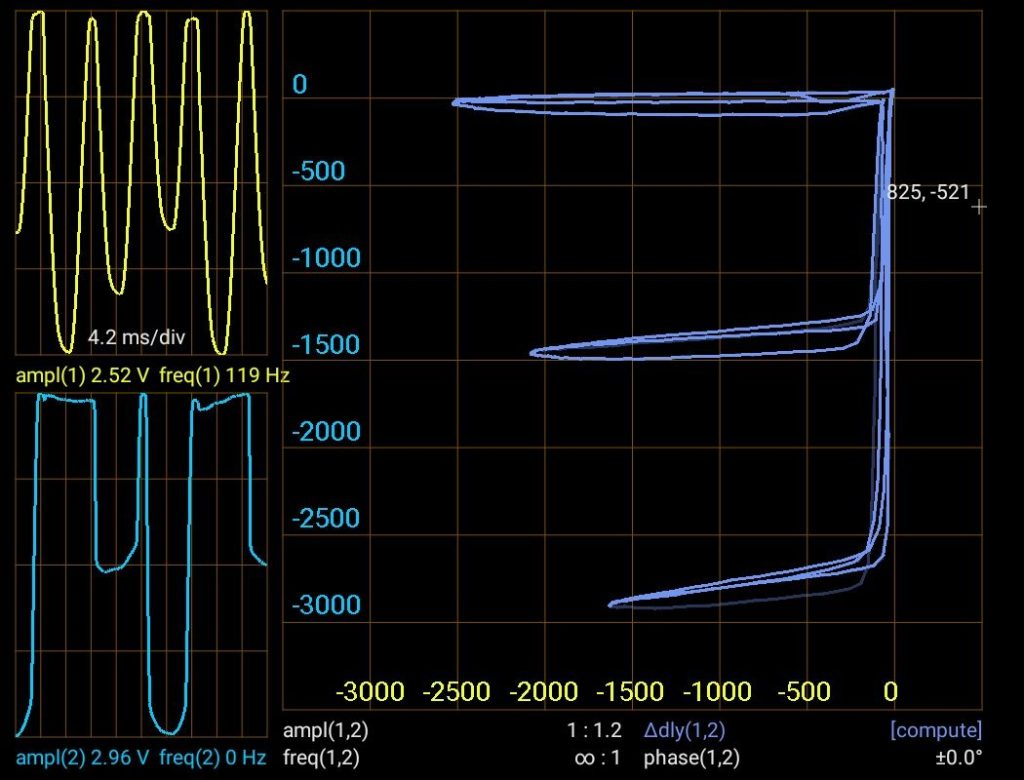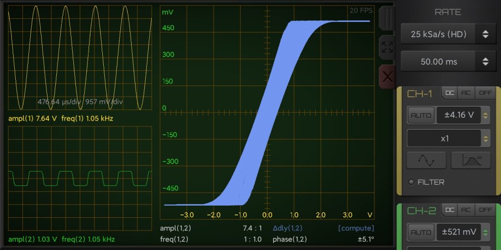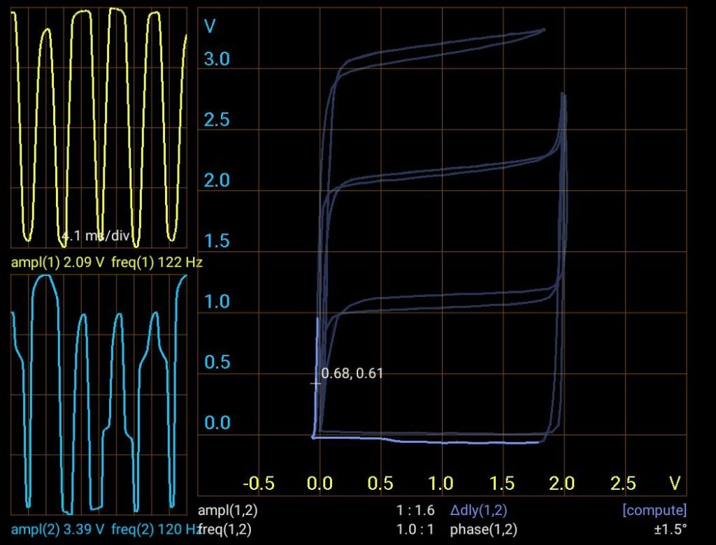 On the right there is the XY Plot with comparison information of the two signals. The phase shift is calculated with the Lissajous method and it is valid just for Sinusoidal Waveforms with same frequency.
